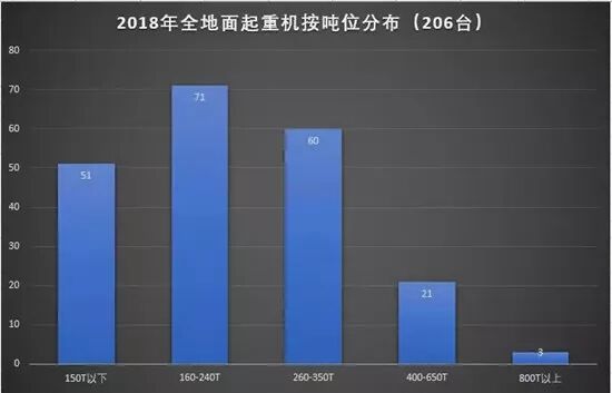 2018年全地面起重机销售主要在350T以下的车型,这种车型一般局限于当地租赁使用,原有车型大部分为60米主臂以下,这几年经过厂家升级改造,新款车型主臂长度均在70米以上,两者在性能差距上越来越明显。